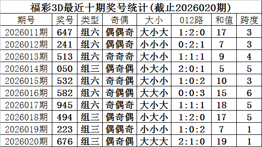 开奖回顾:福彩3D第2026020期奖号为676,奖号形态为:组三、大大大、2:1:0、偶奇偶。
