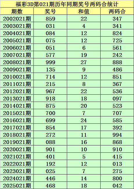 福彩3D第021期,历史上期开出24次奖号,其奖号分别为:859、031、084、075、051、577、999、135、714、215、967、918、875、700、699、854、272、088、901、401、192、025、446、468,奖号两码合差分别开出:
