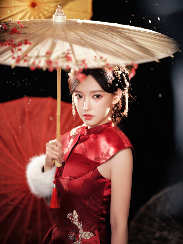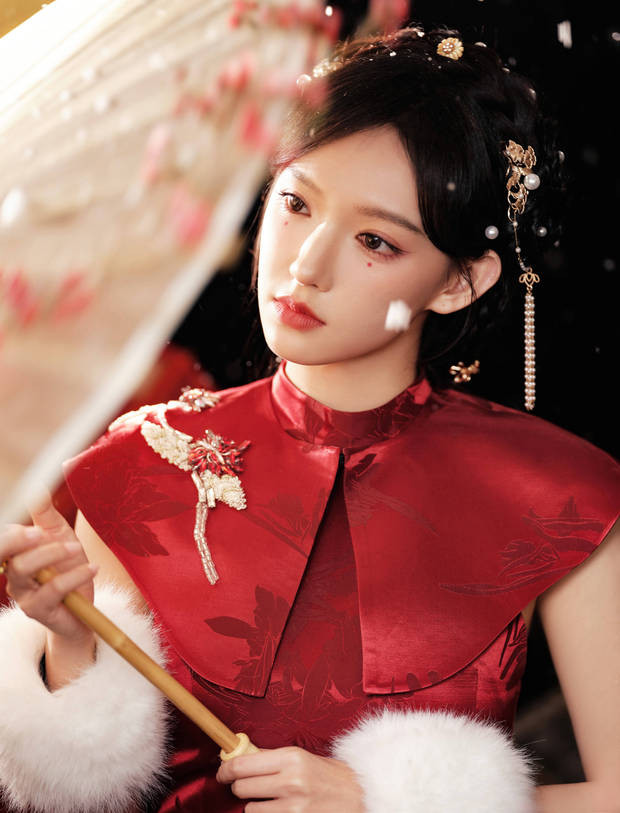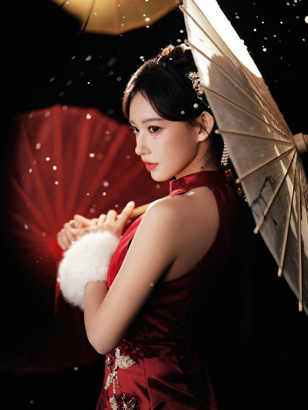 程潇雪中撑伞,红衣瞩目。
