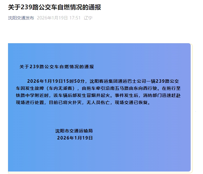 2026年1月19日15时50分,沈阳客运集团通运巴士公司一辆239路公交车因发生故障(车内无乘客),由拖车牵引沿南五马路由东向西行驶。在拖行至铁路中学附近时,该车辆后部发生冒烟并起火。事件发生后,消防部门迅速赶赴现场进行处置,目前已将火扑灭,无人员伤亡,现场交通已恢复。
