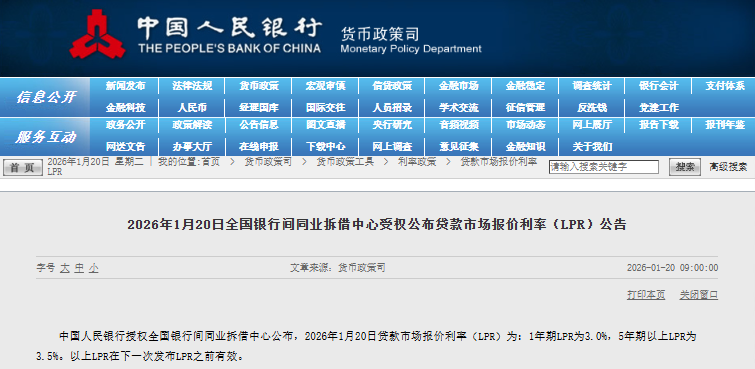 【环球网财经综合报道】1月20日,中国人民银行授权全国银行间同业拆借中心公布最新一期贷款市场报价利率(LPR):1年期LPR为3.0%,5年期以上LPR为3.5%,均较上期维持不变。至此,LPR已连续8个月保持稳定。市场分析普遍认为,开年首期LPR“按兵不动”符合预期,主要源于政策利率锚定效应及银行负债成本考量。尽管LPR保持稳定,但考虑到宏观经济环境及政策导向,市场对于后续降准降息仍抱有期待。