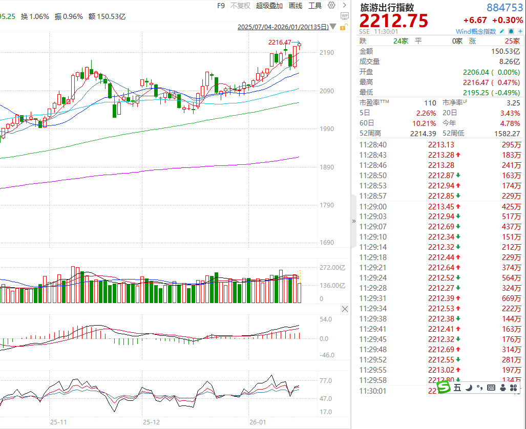【环球网消费综合报道】离2026年春节假期不足一个月,A股市场的旅游出行板块率先闻风而动,走出了一波凌厉的上攻行情。1月19日,随着2026年春运首日(2月2日)火车票正式开始发售,投资者的热情被彻底点燃,Wind旅游出行指数强势领涨大盘,全天收盘涨幅达到2.5%。盘面上,资金做多意愿强烈,大连圣亚、九华旅游两大龙头封死涨停,君亭酒店、三峡旅游、中国中免等权重个股涨幅均超过5%,锦江酒店、天目湖、首旅酒店等也紧随其后,涨幅超4%,板块内呈现普涨格局,春节行情提前预热。