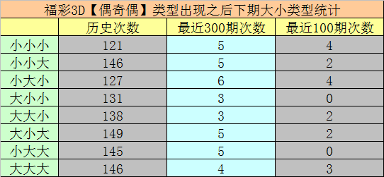 二、最近7次【大大大】奖号之后,其下期分别开出号码:273、689、676、130、681、192、647,其中组三号码出现1次,组六号码出现6次。本期注意组三号码出现。