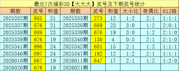 开奖回顾:福彩3D第2026020期奖号为676。奖号为:组三,大小比为3:0,大小类型为:大大大。