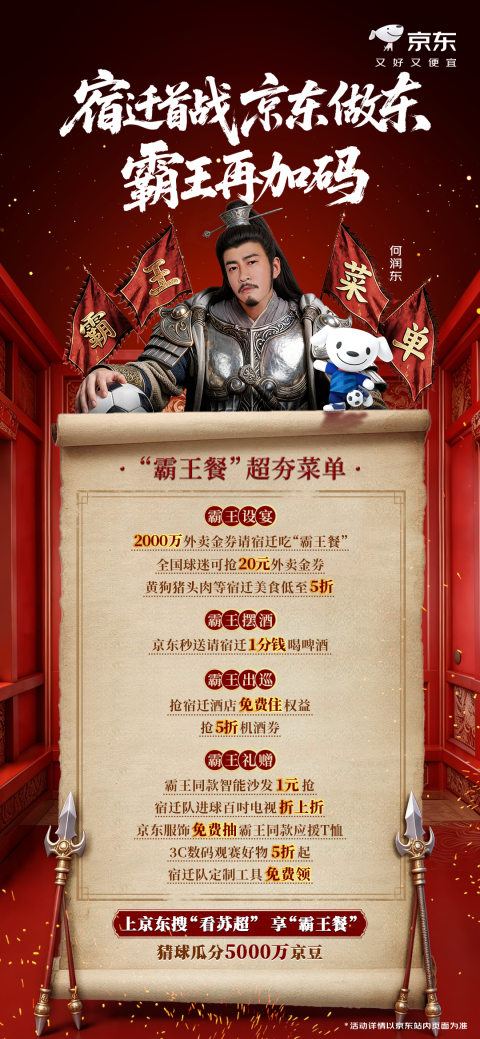 4月18日19时40分,2026年江苏省城市足球联赛(简称“苏超”)宿迁队将在宿迁奥体中心迎来本赛季主场首战。曾在电视剧《楚汉外传》中扮演“西楚霸王”项羽的演员何润东受京东与宿迁文旅邀请,将至今天身穿战甲亮相赛场,为“霸王故里”球队加油讨好。当天,京东联袂何润东再次奉上“霸王餐”,为宿迁队助阵。用户上京东App搜索“看苏超”即可解锁十余项“霸王餐”福利,猜球还有契机中分5000万京豆。