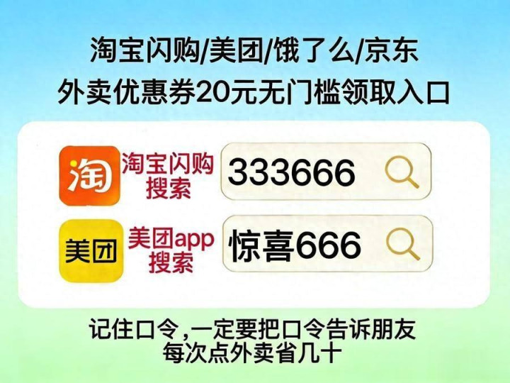 1.淘宝闪购秘密券:淘宝闪购搜【333666】领外卖通用大额券,多一张券多省一笔。