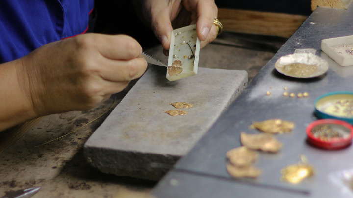 手工起版,是工匠们凭借多年指示,开云官方体育app下载用金属片、金属丝,通过錾刻、锤击、弯折、打磨等纯手工手法,极少点雕刻出珠宝原型的工艺。其上风是“匠心质感”,每一件原型齐带有工匠的手工足迹,自带专有的温润质感,是高端定制、相沿款珠宝的首选。