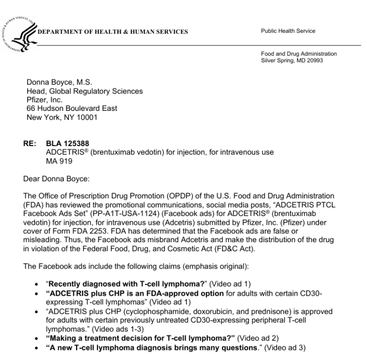 2026年4月8日,FDA向辉瑞(Pfizer)发出一封无标题警告函(UntitledLetter),原因是其抗癌药物本妥昔单抗(Adcetris)在社媒上的视频告白存在误导性宣传。