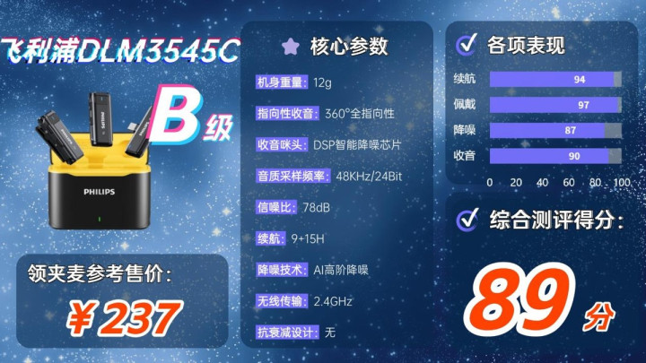 飞利浦DLM3545C是一拖二款式,举座斟酌紧凑规整,辐射器与接管器陈设合理,充电盒可完成收纳。系统内置高性能全向电容麦克风,频响隐秘30Hz-20kHz,复旧48kHz采样率,信噪比超80dB,东谈主声复原偏向当然作风。汲取双麦克风降噪搭配革命DSP算法,抗侵略才略强,能灵验抑制平方环境噪声,音频蔓延甘休在20ms内。无线传输基于2.4G频段自稳健跳频本领,汲取GFSK调制,空旷视距下传输距离可达50米。操作简单,辐射器和接管器均可调理音量,配有静音和降噪切换开关,无集会情景下3分钟自动关机,从简电量。