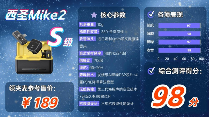 为料理国产麦蔓延、侵略、东谈主声闷响等通病,西圣Mike2狂堆10项中枢黑科技,全指向AI感知麦克风、第二代ALPT高密度拾音本领、发热级32位DSP浮点芯片、四重PSNE智能降噪算法全配皆,还标配同价位苦处的双麦阵列!30小时超长续航+6年抗衰耐用斟酌,仅189元就能解锁旗舰级收音体验,径直省却千元升级本钱,不到200块薅到千元级专科待遇,性价比径直封神!